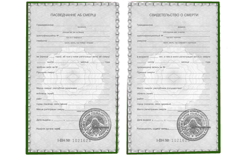 Официальное свидетельство составляют на двух государственных языках – русском и белорусском – на правой и левой сторонах бланка соответственно. В бланк вписывают сведения об усопшем: паспортные данные, номер-идентификатор, установленную дату ухода из жизни, возраст, а также дату регистрации смерти в ЗАГС и номер соответствующей записи. В свидетельстве приводят основную причину летального исхода, указывают место, где произошла и была зарегистрирована смерть, а также дату оформления документа. Внизу отводится поле для подписи руководителя отделения ЗАГС, и проставляется печать. Самая нижняя строка на свидетельстве – его уникальные серия и номер, которые пропечатываются на обоих разворотах.