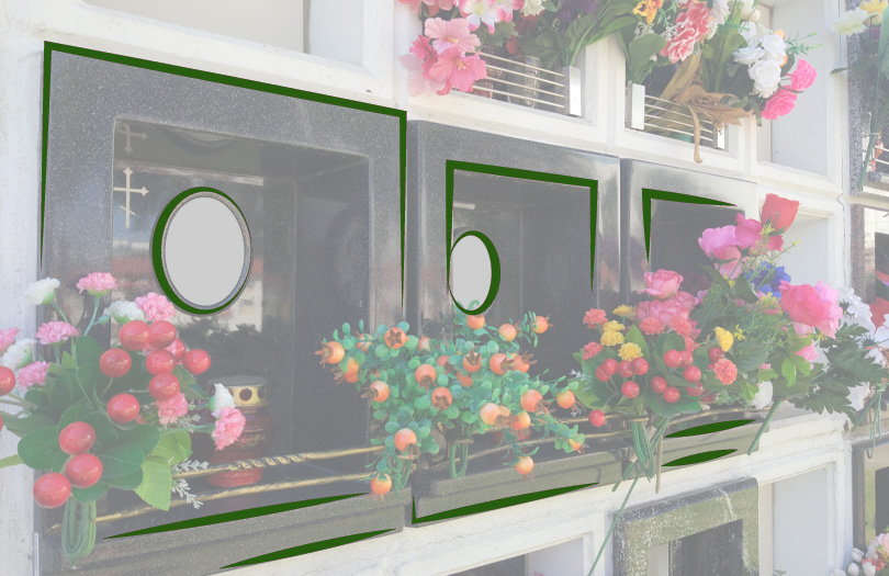 Вертикальный открытый колумбарий. Стена с рядами ниш высотой около 1,5 метра. Нижний ярус начинается где-то в 50 см от земли, для удобства пользования.